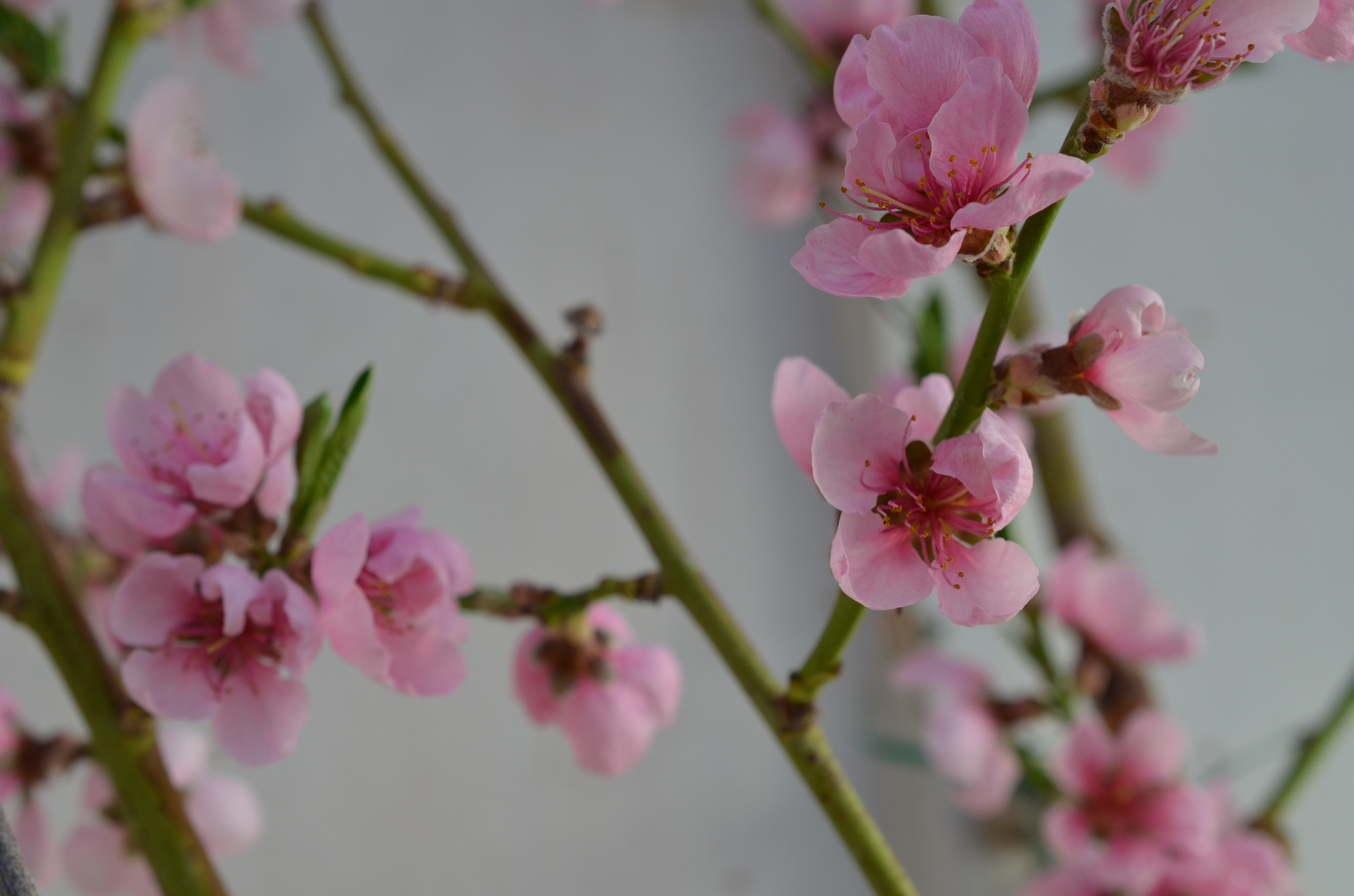 I växthuset blommar persikoträdet. En ensam humledrottning har förirrat sig in i växthuset och låter sig väl smaka av vårens första nektar. Kanske slipper jag ta fram ekorrhårspenseln för att pollinera i år.