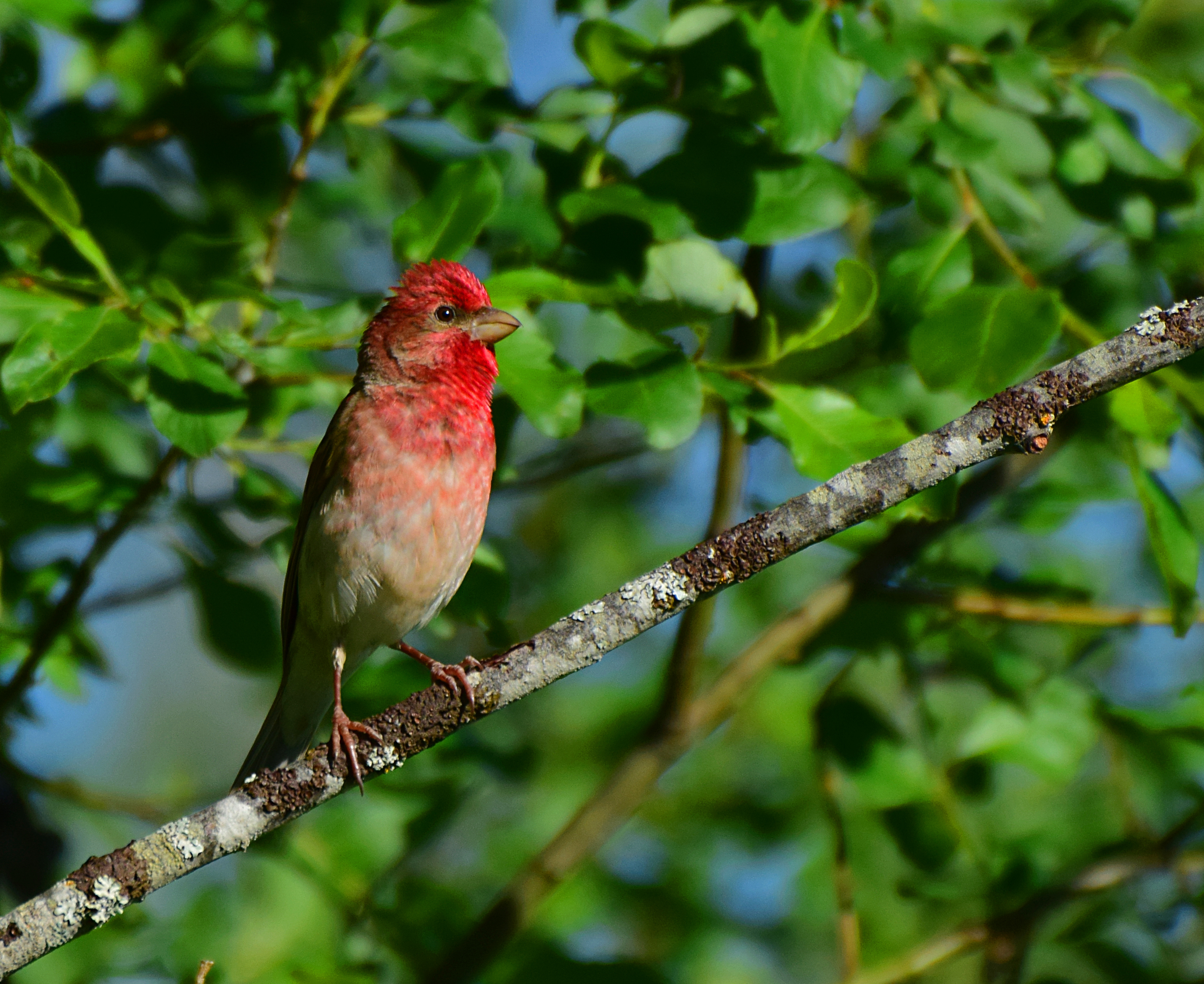 Vid morgonpromenaden förbi Mödänge hör jag en välbekant sång. Det är rosenfinken som sjunger sin korta strof ”pleased to see you”. Jag svarar med ”pleased to see you too”.  Man kan inte göra annat, när denna långflyttare upprepar sin ramsa.  Bröstet är karmosinfärgat på fågeln och  gnistrar som en rubin i morgonsolen. Med rätta upplevs den som exotisk på våra breddgrader. Den tillhör de fåtal fåglar som kommer flyttande från sydost,  närmare bestämt Indien där huvuddelen av det svenska beståndet övervintrar.