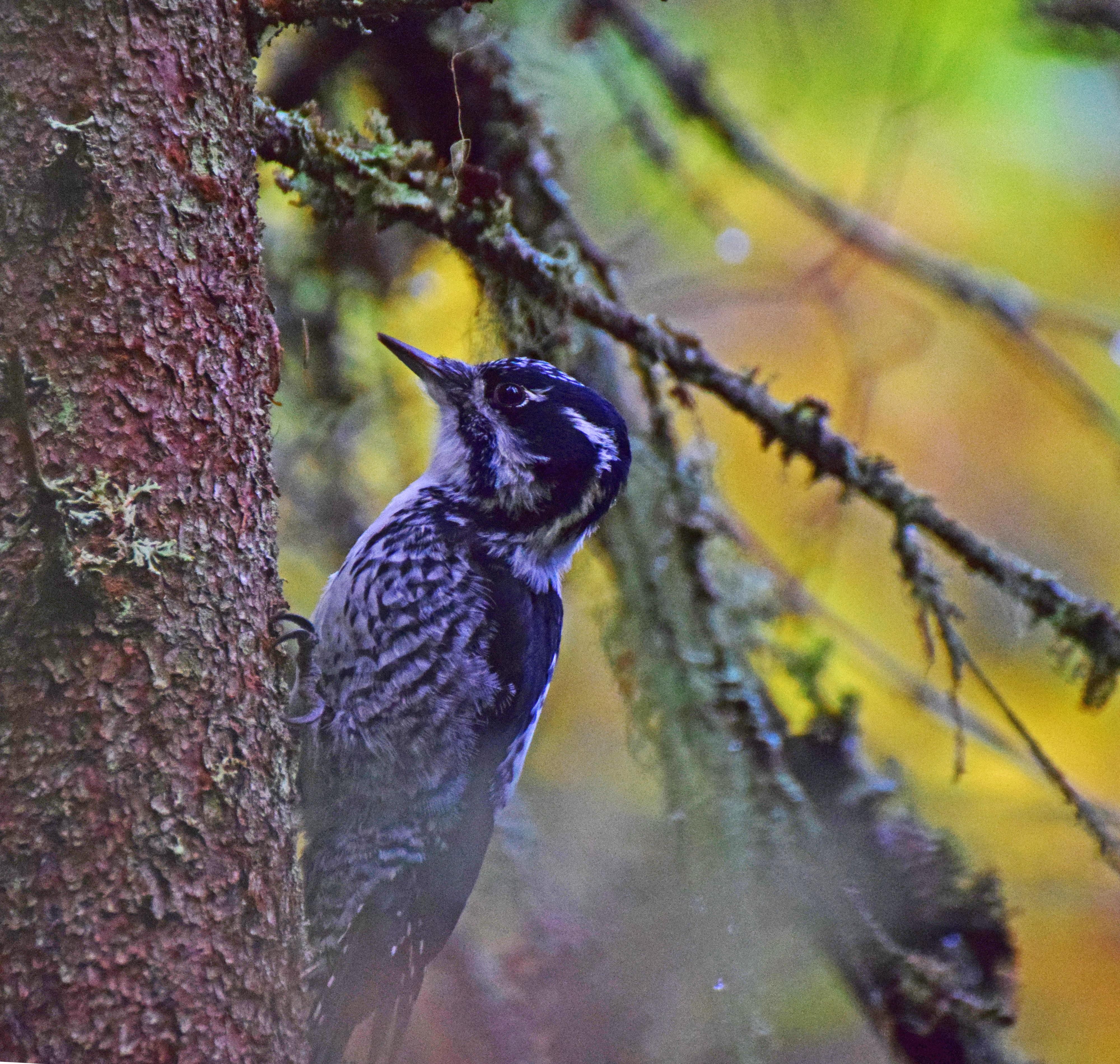 Helt ensam är jag inte i den gamla granskogen, ett stilla knackande, leder mig till en annan som älskar gammelskog. Den tretåiga hackspetten har inte så många platser att hacka på. Det är just den här sortens skog som vi, den tretåiga och jag är beroende av.