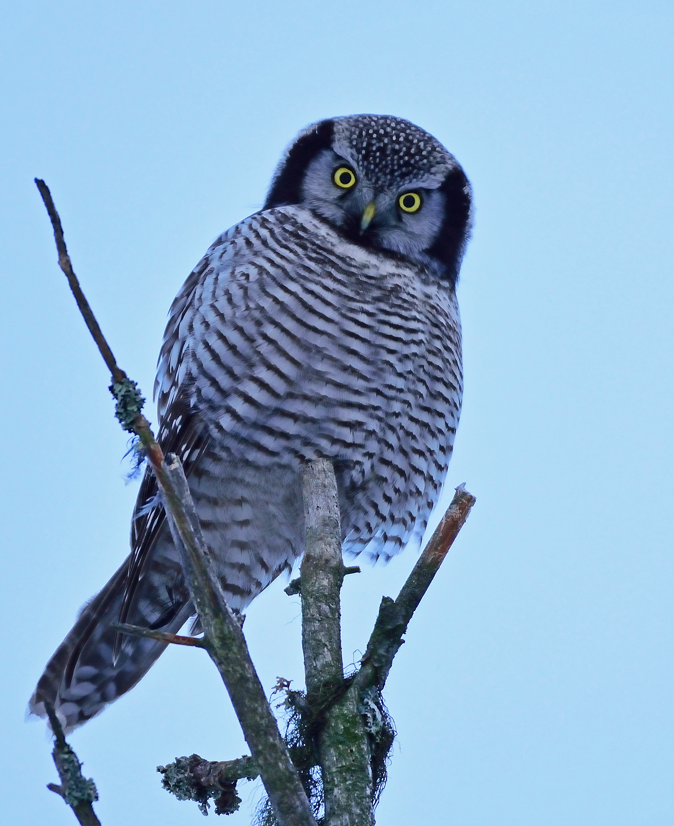 Det är bistra tider på skogen… En lång vinter med kyla och tjockt snötäcke. Hökugglan upptäcker jag i toppen av en torrtall. Den spanar efter mat och är tämligen ointresserad av gubben på skidor. Den skänker mig en genomborrande blick  och fortsätter sedan med sin betydligt viktigare sysselsättning.