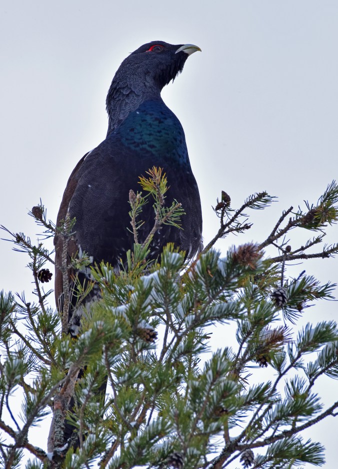 Tjädertuppen behöver inte spana efter mat. Den sitter mitt i maten. Tallbarrsdieten är nog enahanda men ganska enkel att finna… Märkligt nog duger inte vilka tallbarr som helst utan det är vissa ”tjädertallar” som erbjuder rätt sorts barr.