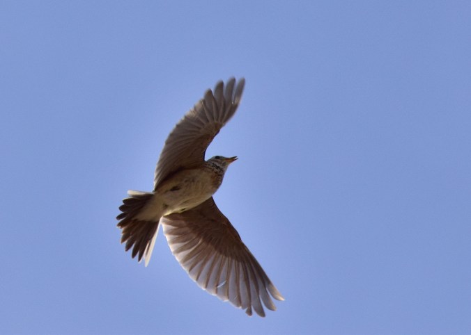 Ibland bjuder naturen på sällsamma uppvisningar. I det här fallet två sånglärkor under ett intensivt parningsbestyr. Paret följer varandra i böljande flykt omväxlande med en drillande sångflykt. Skådespelet jag bjuds på varar i flera minuter innan de försvinner till andra sidan fältet. Jordbruksmarkerna i byarna Freluga/ Edstuga lämpar sig väl för flera av de arter som idag nationellt sett minskar sin population. Här dominerar fortfarande ganska småskaligt jordbruk. Sånglärkan är en av de arterna som av allt att döma missgynnas av modernt intensivt jordbruk. Sedan i mitten av 1970 talet har arten minskat med cirka 75%.